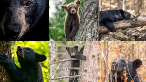 This collage shows several American black bears at the Vince Shute Wildlife Sanctuary in Minnesota.