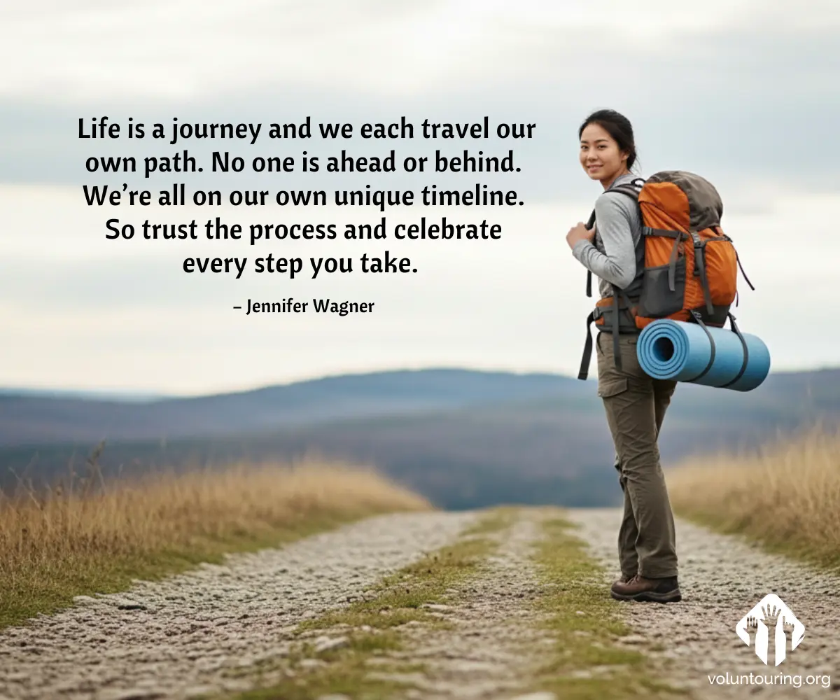 Life is a journey and we each travel our own path. No one is ahead or behind. We’re all on our own unique timeline. So trust the process and celebrate every step you take. – Jennifer Wagner