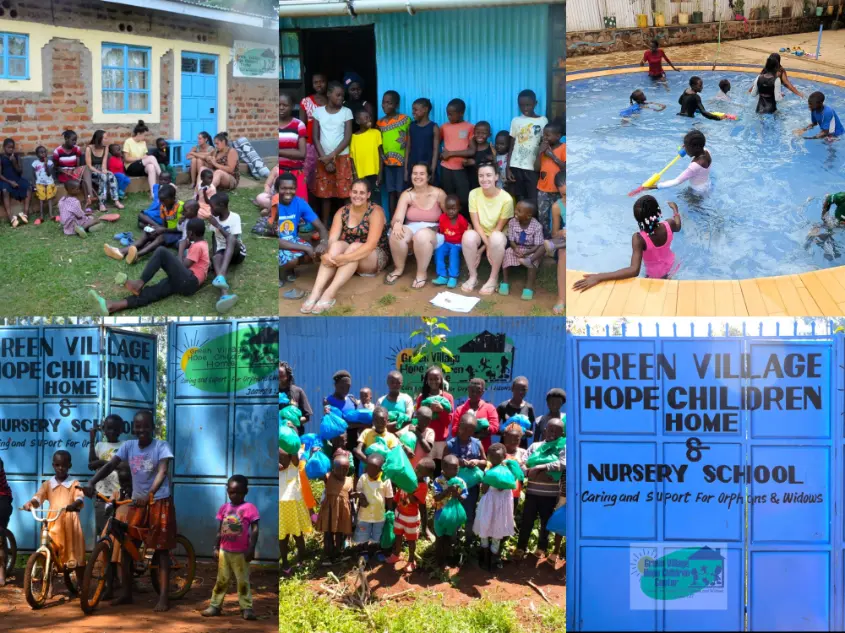 Scenes from Green Village Hope Children Home in Ipali, Vihiga County, Kenya, capture everyday life and the impact volunteers make. Children gather outside the brick home for songs and stories, while another group smiles beside visiting volunteers at the blue corrugated classroom. Kids enjoy a safe swimming session, building confidence and learning water skills. At the front gate, bicycles and laughter hint at playful rides around the compound. A community outreach moment shows families receiving food parcels and essentials. The gate panels display the name of the home and nursery school, a promise of care and support for orphans and widows. Volunteers contribute to childcare, teaching, farming, building, fundraising, health assistance and digital tasks, typically 4 to 5 hours a day. Accommodation, meals and Wi Fi are provided, with no program fees, only optional donations. All ages and volunteers with disabilities are welcome to join a warm, purpose driven community.