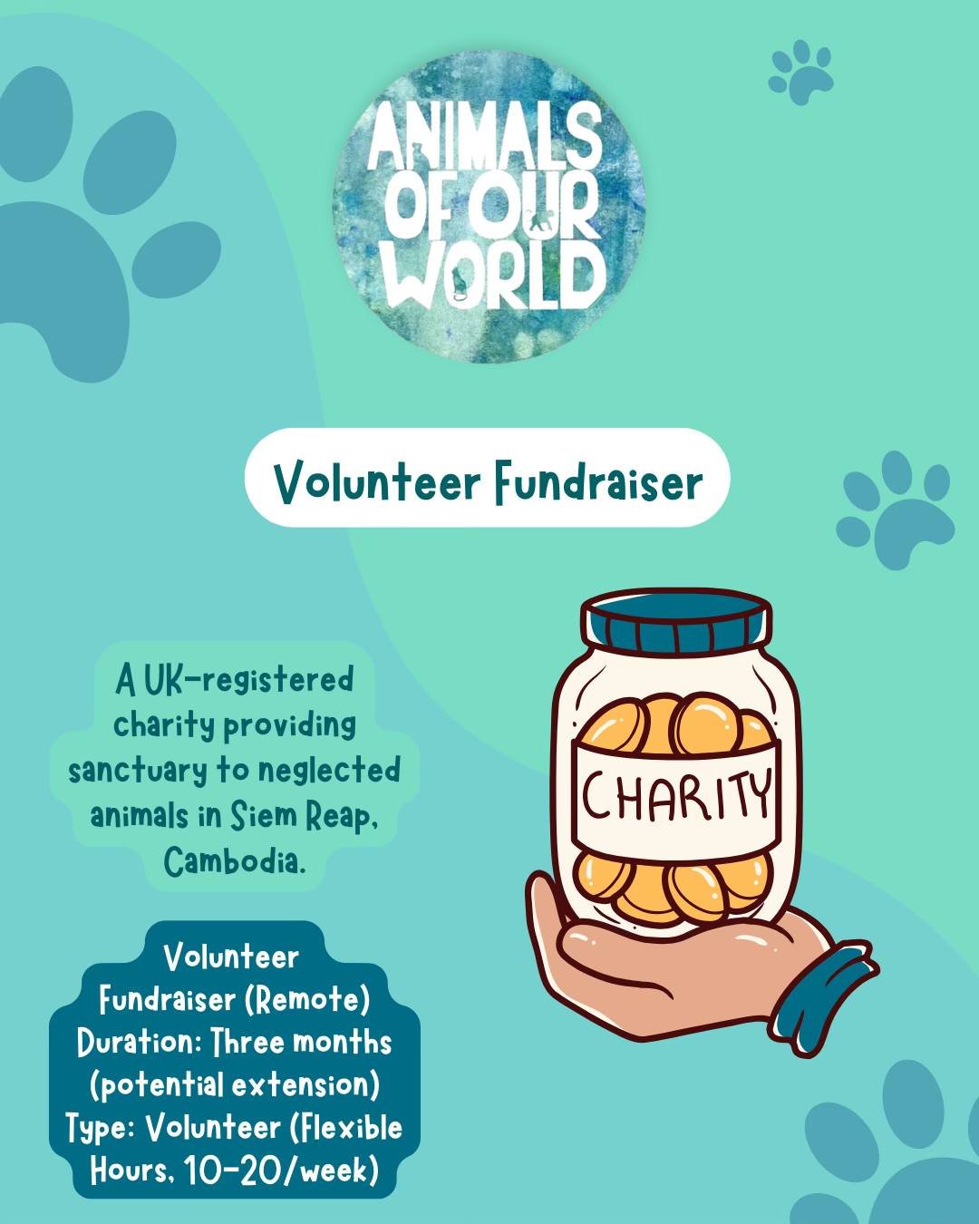 Remote volunteer fundraiser Cambodia poster for Animals of Our World, flexible 10–20 hours weekly, three months.